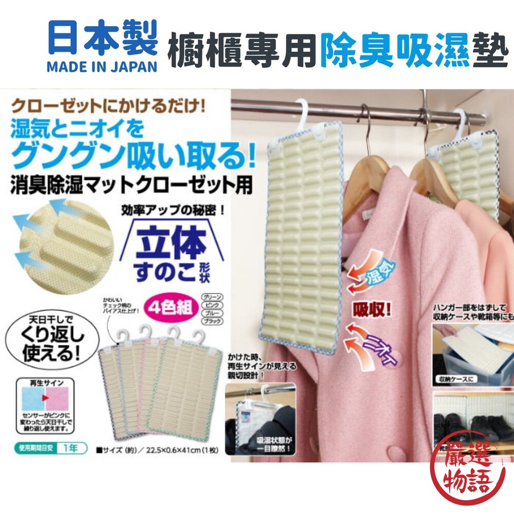 商品名稱:日本製 櫥櫃專用 除臭吸濕墊 4入 | 掛勾式 重複使用 衣櫃除溼 鞋櫃消臭 除濕 除臭