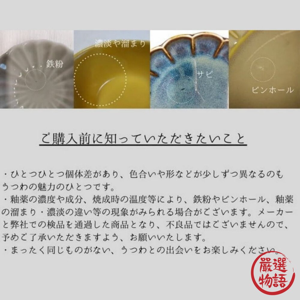 可能有雜點/黑白點/凹凸/氣孔/流釉/上色不均/色差現象/色暈現象/窯變/尺寸上微落差現象...等現象,