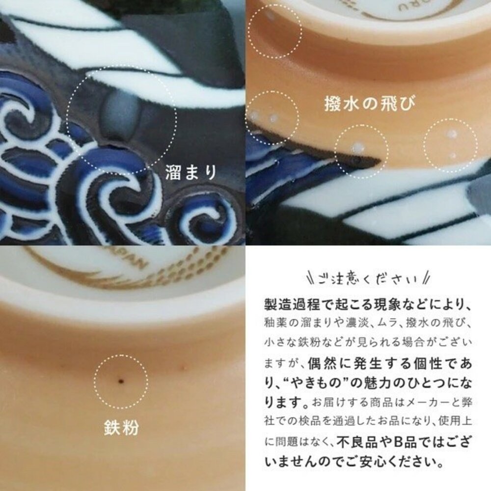 可能有雜點/黑白點/凹凸/氣孔/流釉/上色不均/色差現象/色暈現象/窯變/尺寸上微落差現象...等現象,
