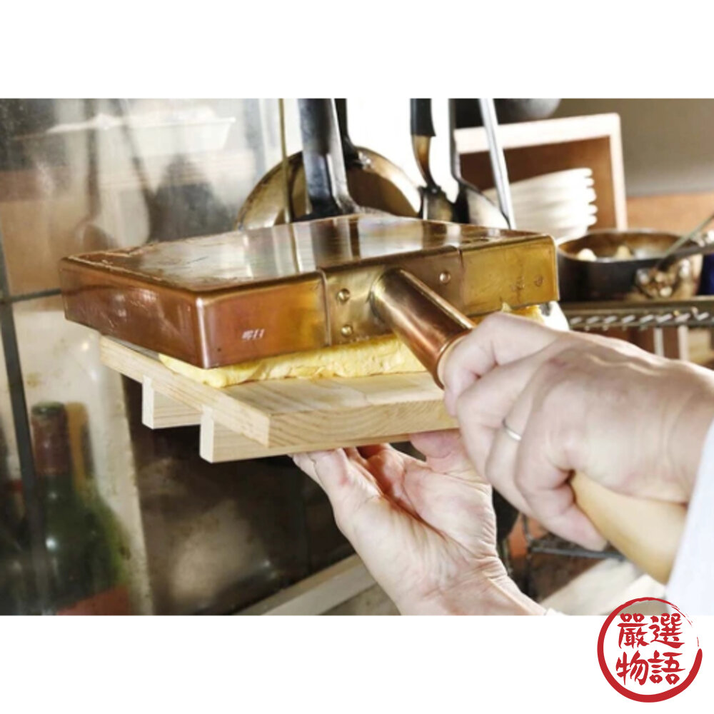 玉子燒(卵焼き)是日本家傳戶曉的國民料理,各地玉子燒無論在味道和外形都有各自的特色,不過最基本的劃分是「東甜西鹹」。順帶一提用來製作玉子燒的「卵焼き器」亦有分東西。「東型」:又稱「角型」,呈四方狀,適合不需要太多翻摺的關東風玉子燒。如果你好好照顧玉子燒鍋,它會變得更容易使用。清潔銅時應小心,因為它對水分和氯敏感。