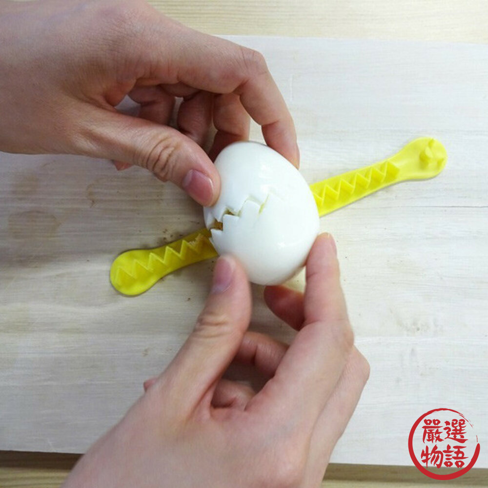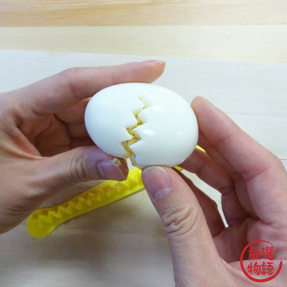 (1) 將煮好的雞蛋放在產品的鋸齒邊緣,然後滾動,使產品的鋸齒邊緣碰到煮雞蛋的中心。