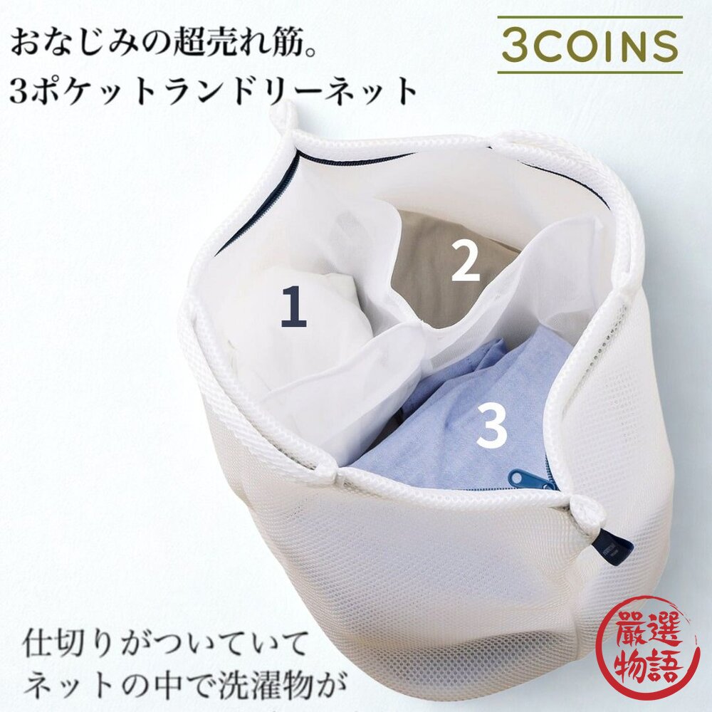 日本 3COINS 洗衣救星 三格層加厚洗衣網袋 附把手 抗菌防臭 襪子 衣物分隔洗衣籃 一目瞭然