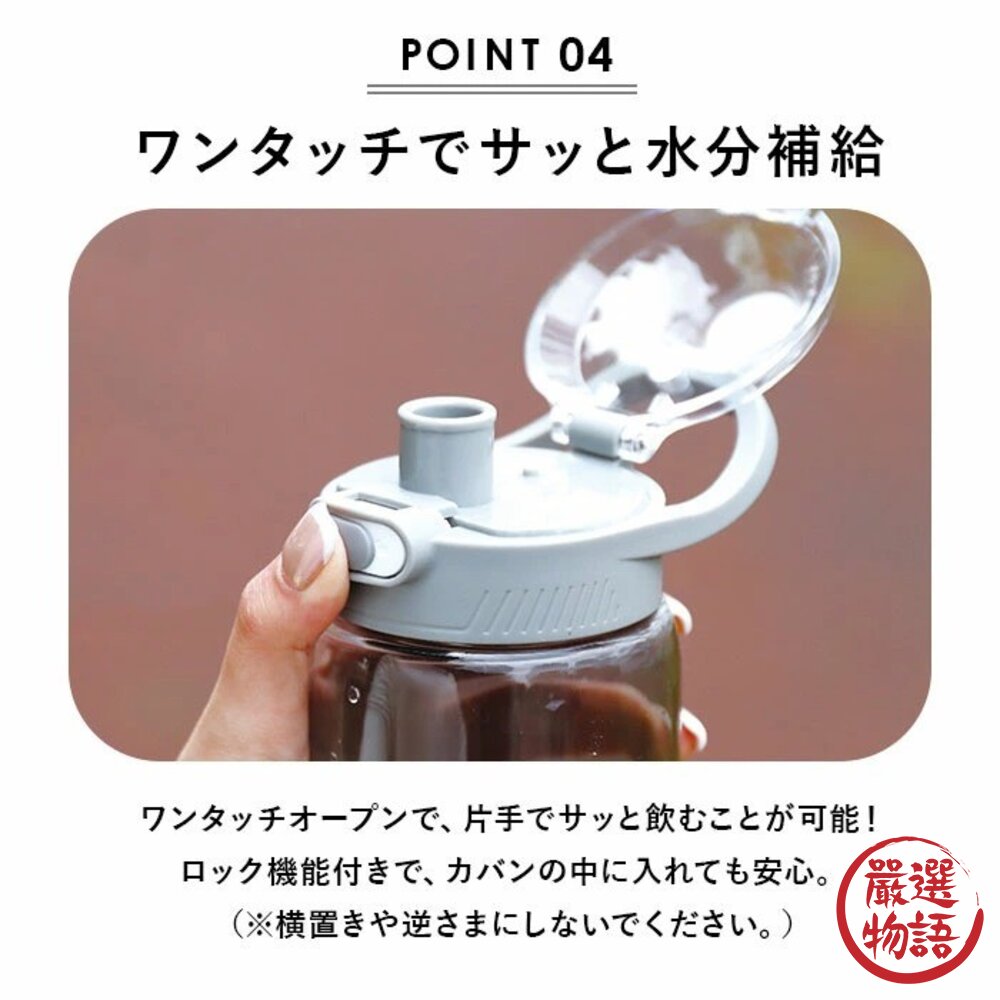 一鍵式設計,單手即可輕鬆開合。此外,鎖定功能讓您即使放在包包裡也無需擔心蓋子打開。外出或運動時,也能輕鬆補充水分。