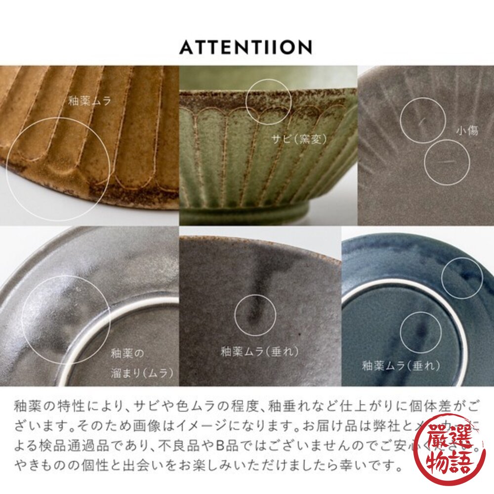 陶瓷製品因工藝問題及燒製過程,窯烤狀況和溫度的差異,可能有雜點/黑白點/凹凸/氣孔/流釉/上色不均/色差現象/色暈現象/窯變/尺寸上微落差現象...等現象,以上皆不會影響使用,亦不屬商品瑕疵,請您理解後再行購買,完美主義者請勿下單喔!