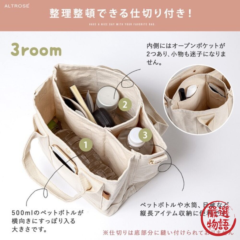 標籤:#日本, #ALTROSE, #三分隔帆布, #托特包, #3Room, #迷你單肩斜挎包, #肩背手提包, #三格, #帆布包, #肩背包女, #日本進口