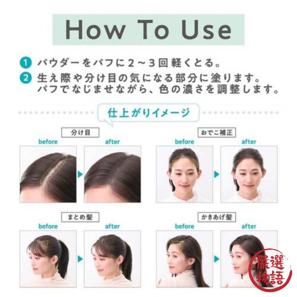 用粉撲輕拍粉餅2~3次,塗抹於生髮際線、分線或稀疏髮根部位。